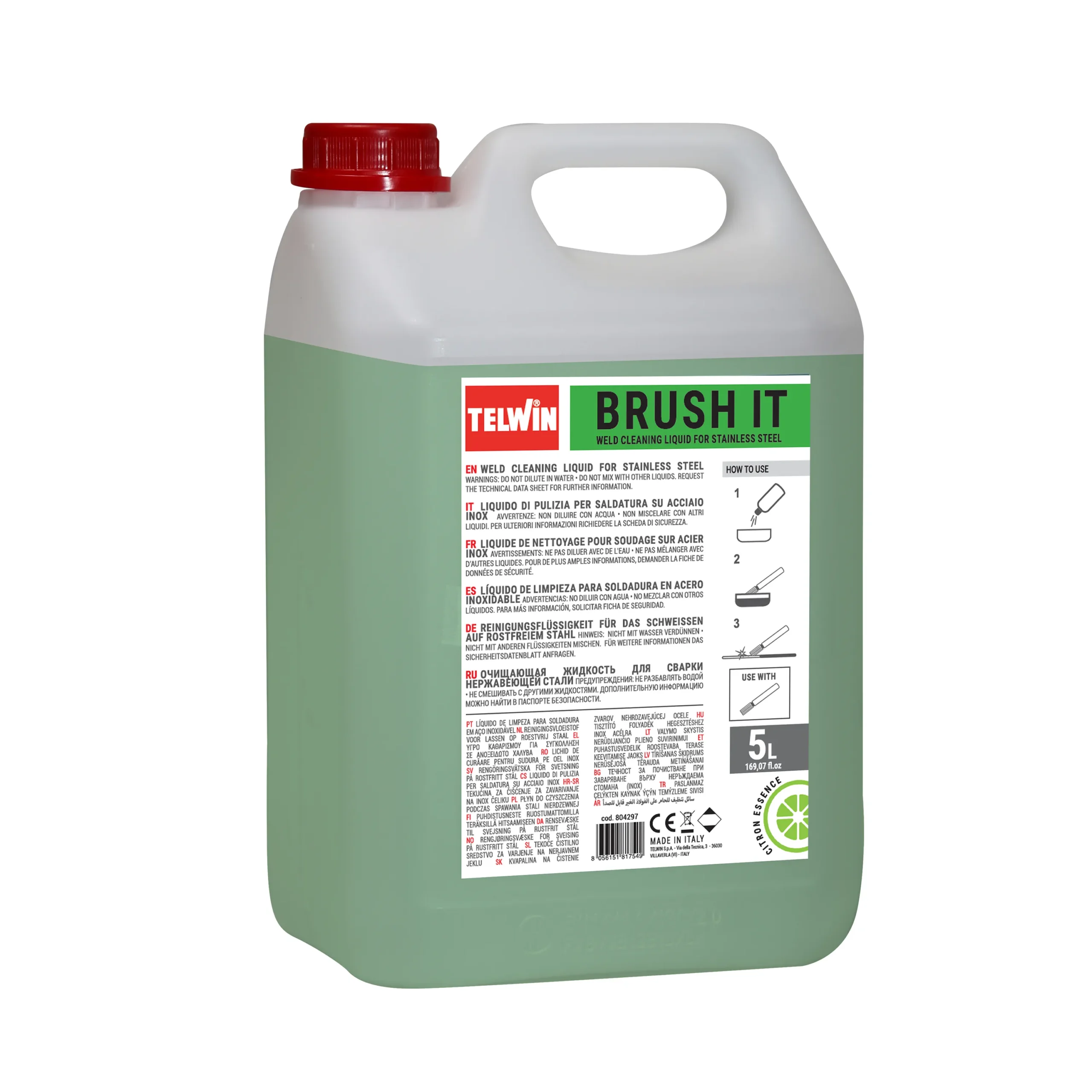 BRUSH IT TELWIN líquido de limpieza para soldadura en acero inoxidable en presentación de 5 litros, esencia cítrica.